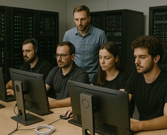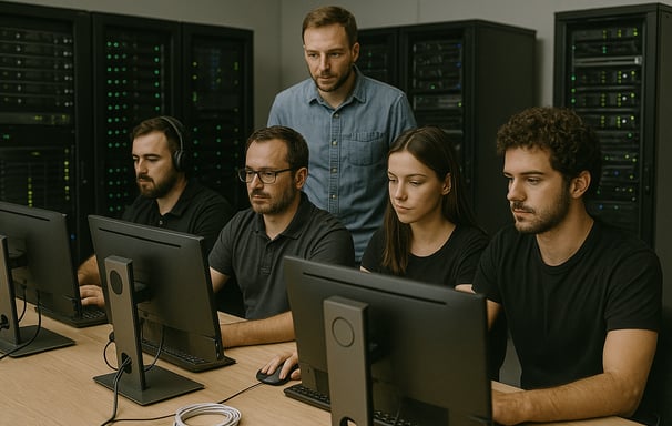 Liderada por Lucas Almeida, CTO da empresa, a equipe de Tecnologia e Infraestrutura projeta e mantém toda a arquitetura de rede e os sistemas de TI. Entre suas atribuições estão o gerenciamento de switches e roteadores, a manutenção de servidores Linux (Apache/MySQL, Samba4) e workstations, a implementação de políticas de segurança (firewalls, IDS/IPS) e a operação do ambiente de backup Bacula Community, garantindo alta disponibilidade e proteção contínua dos dados.